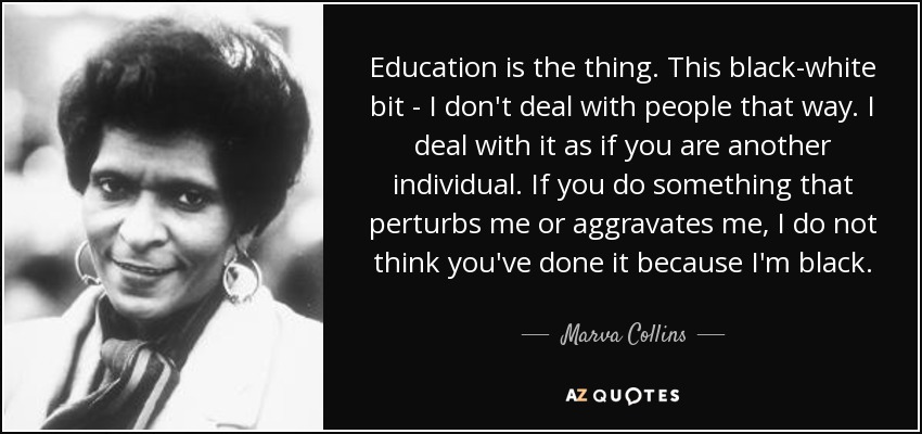 Education is the thing. This black-white bit - I don't deal with people that way. I deal with it as if you are another individual. If you do something that perturbs me or aggravates me, I do not think you've done it because I'm black.
