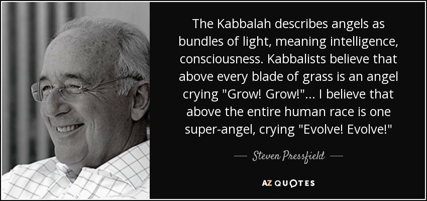 The Kabbalah describes angels as bundles of light, meaning intelligence, consciousness. Kabbalists believe that above every blade of grass is an angel crying "Grow! Grow!" ... I believe that above the entire human race is one super-angel, crying "Evolve! Evolve!"