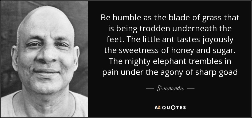 Be humble as the blade of grass that is being trodden underneath the feet. The little ant tastes joyously the sweetness of honey and sugar. The mighty elephant trembles in pain under the agony of sharp goad