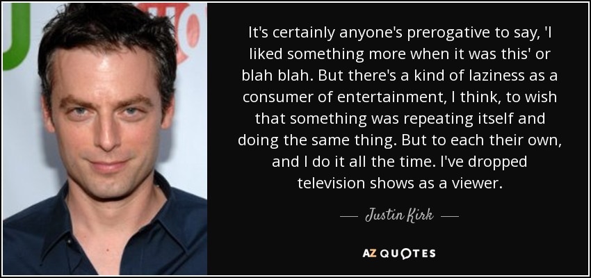 It's certainly anyone's prerogative to say, 'I liked something more when it was this' or blah blah. But there's a kind of laziness as a consumer of entertainment, I think, to wish that something was repeating itself and doing the same thing. But to each their own, and I do it all the time. I've dropped television shows as a viewer.