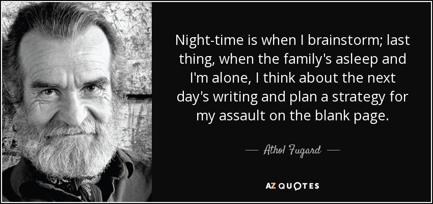 Night-time is when I brainstorm; last thing, when the family's asleep and I'm alone, I think about the next day's writing and plan a strategy for my assault on the blank page.