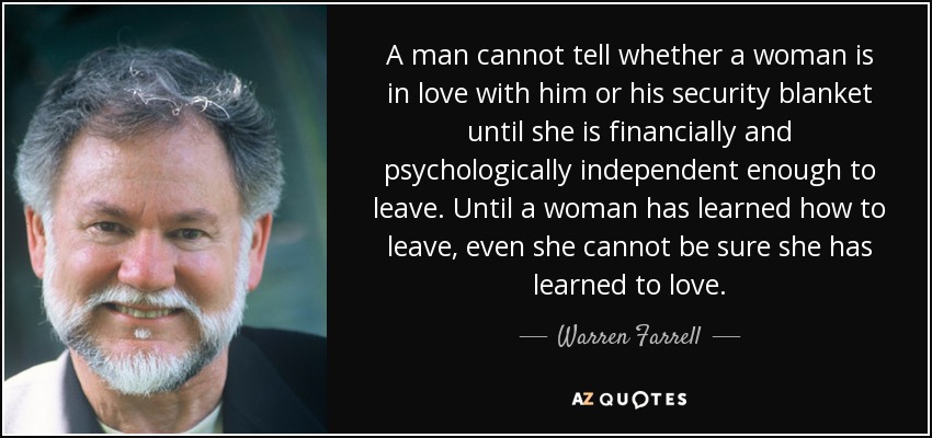 A man cannot tell whether a woman is in love with him or his security blanket until she is financially and psychologically independent enough to leave. Until a woman has learned how to leave, even she cannot be sure she has learned to love.
