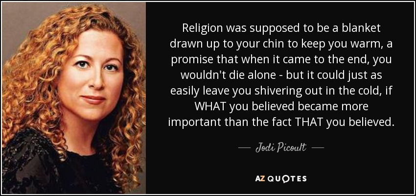 Religion was supposed to be a blanket drawn up to your chin to keep you warm, a promise that when it came to the end, you wouldn't die alone - but it could just as easily leave you shivering out in the cold, if WHAT you believed became more important than the fact THAT you believed.