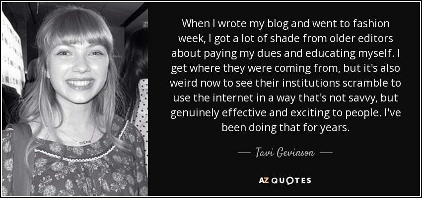 When I wrote my blog and went to fashion week, I got a lot of shade from older editors about paying my dues and educating myself. I get where they were coming from, but it's also weird now to see their institutions scramble to use the internet in a way that's not savvy, but genuinely effective and exciting to people. I've been doing that for years.