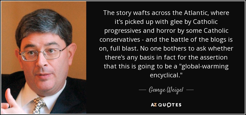 The story wafts across the Atlantic, where it's picked up with glee by Catholic progressives and horror by some Catholic conservatives - and the battle of the blogs is on, full blast. No one bothers to ask whether there's any basis in fact for the assertion that this is going to be a "global-warming encyclical."