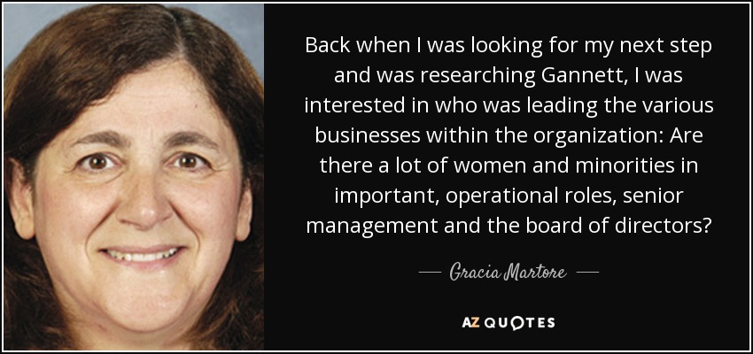 Back when I was looking for my next step and was researching Gannett, I was interested in who was leading the various businesses within the organization: Are there a lot of women and minorities in important, operational roles, senior management and the board of directors?