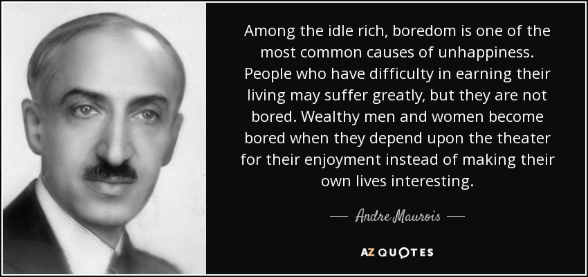 Among the idle rich, boredom is one of the most common causes of unhappiness. People who have difficulty in earning their living may suffer greatly, but they are not bored. Wealthy men and women become bored when they depend upon the theater for their enjoyment instead of making their own lives interesting.