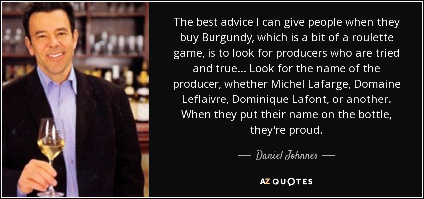 The best advice I can give people when they buy Burgundy, which is a bit of a roulette game, is to look for producers who are tried and true... Look for the name of the producer, whether Michel Lafarge, Domaine Leflaivre, Dominique Lafont, or another. When they put their name on the bottle, they're proud.