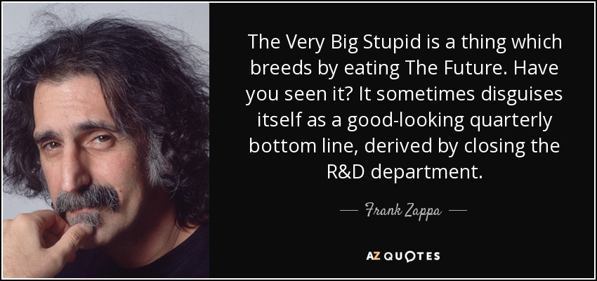 The Very Big Stupid is a thing which breeds by eating The Future. Have you seen it? It sometimes disguises itself as a good-looking quarterly bottom line, derived by closing the R&D department.