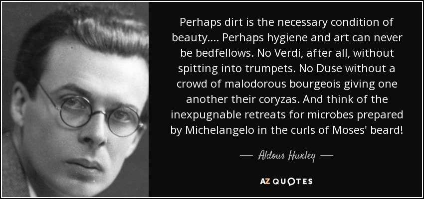 Perhaps dirt is the necessary condition of beauty.... Perhaps hygiene and art can never be bedfellows. No Verdi, after all, without spitting into trumpets. No Duse without a crowd of malodorous bourgeois giving one another their coryzas. And think of the inexpugnable retreats for microbes prepared by Michelangelo in the curls of Moses' beard!