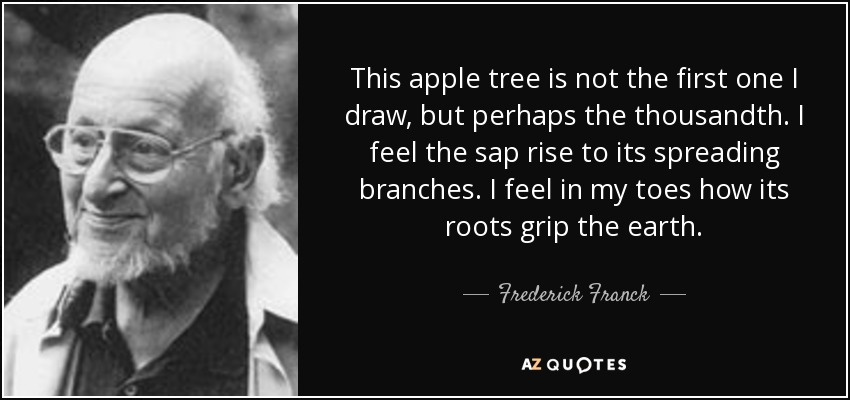 This apple tree is not the first one I draw, but perhaps the thousandth. I feel the sap rise to its spreading branches. I feel in my toes how its roots grip the earth.