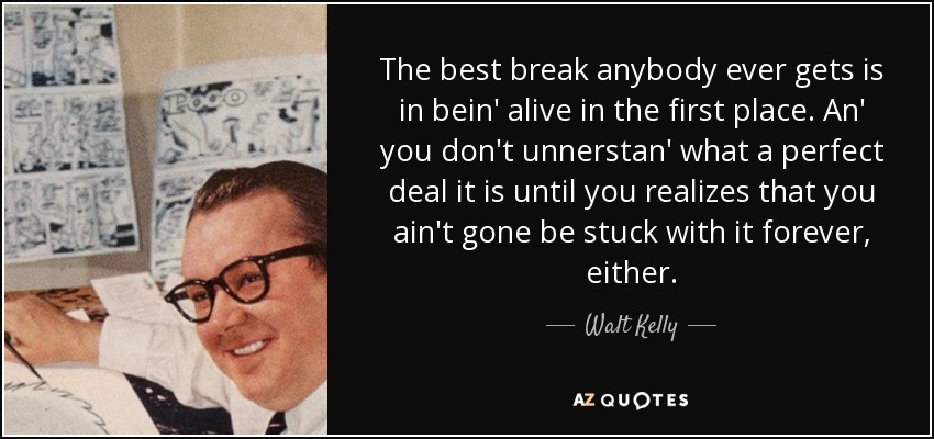 The best break anybody ever gets is in bein' alive in the first place. An' you don't unnerstan' what a perfect deal it is until you realizes that you ain't gone be stuck with it forever, either.