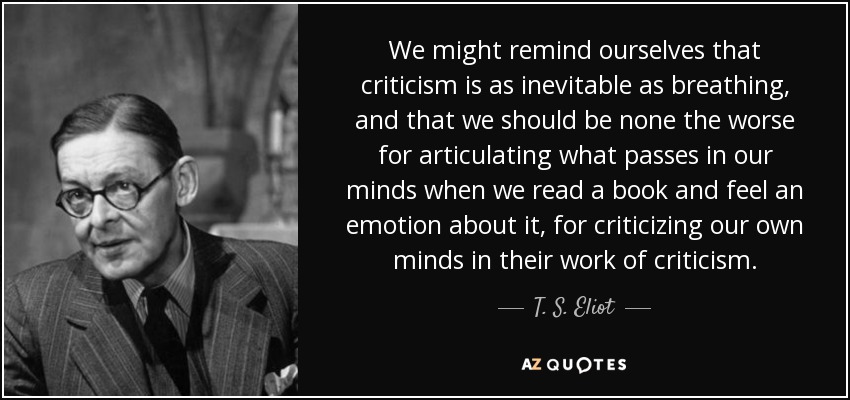 We might remind ourselves that criticism is as inevitable as breathing, and that we should be none the worse for articulating what passes in our minds when we read a book and feel an emotion about it, for criticizing our own minds in their work of criticism.