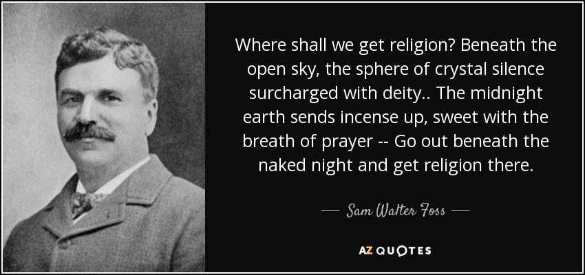 Where shall we get religion? Beneath the open sky, the sphere of crystal silence surcharged with deity.. The midnight earth sends incense up, sweet with the breath of prayer -- Go out beneath the naked night and get religion there.