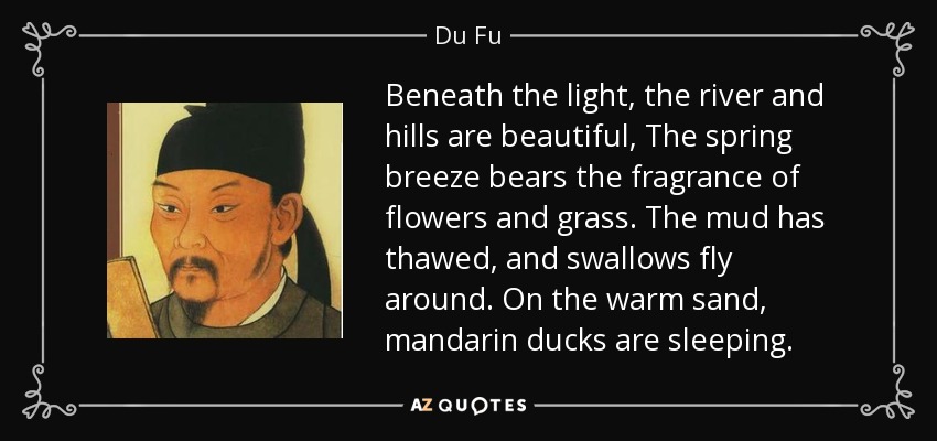 Beneath the light, the river and hills are beautiful, The spring breeze bears the fragrance of flowers and grass. The mud has thawed, and swallows fly around. On the warm sand, mandarin ducks are sleeping.