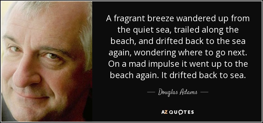 A fragrant breeze wandered up from the quiet sea, trailed along the beach, and drifted back to the sea again, wondering where to go next. On a mad impulse it went up to the beach again. It drifted back to sea.