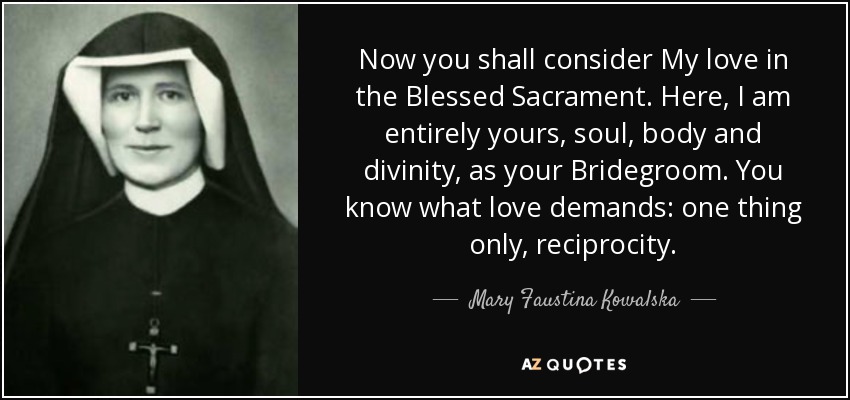 Now you shall consider My love in the Blessed Sacrament. Here, I am entirely yours, soul, body and divinity, as your Bridegroom. You know what love demands: one thing only, reciprocity.