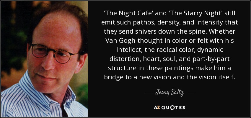 'The Night Cafe' and 'The Starry Night' still emit such pathos, density, and intensity that they send shivers down the spine. Whether Van Gogh thought in color or felt with his intellect, the radical color, dynamic distortion, heart, soul, and part-by-part structure in these paintings make him a bridge to a new vision and the vision itself.