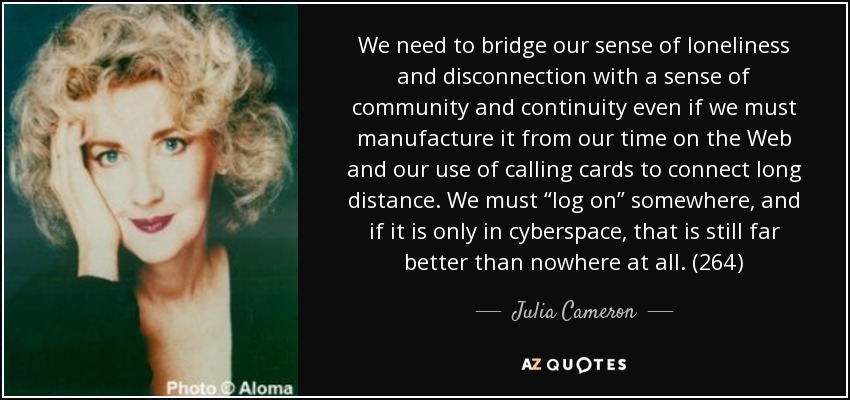 We need to bridge our sense of loneliness and disconnection with a sense of community and continuity even if we must manufacture it from our time on the Web and our use of calling cards to connect long distance. We must “log on” somewhere, and if it is only in cyberspace, that is still far better than nowhere at all. (264)