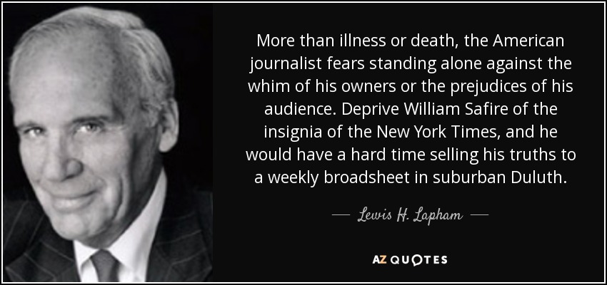 More than illness or death, the American journalist fears standing alone against the whim of his owners or the prejudices of his audience. Deprive William Safire of the insignia of the New York Times, and he would have a hard time selling his truths to a weekly broadsheet in suburban Duluth.