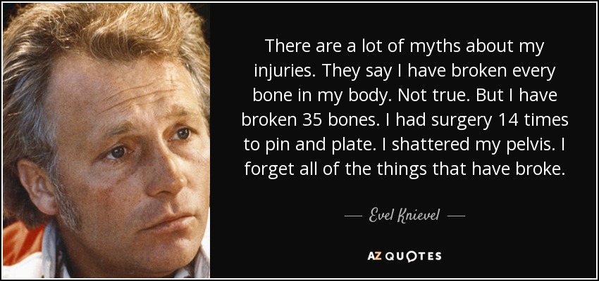 There are a lot of myths about my injuries. They say I have broken every bone in my body. Not true. But I have broken 35 bones. I had surgery 14 times to pin and plate. I shattered my pelvis. I forget all of the things that have broke.