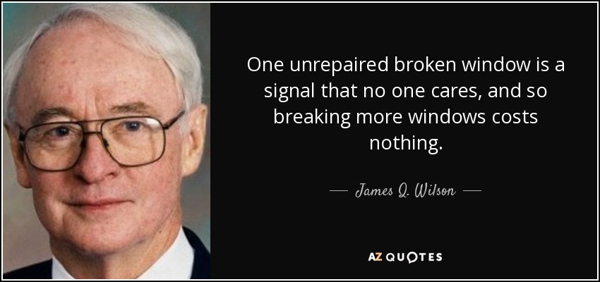 One unrepaired broken window is a signal that no one cares, and so breaking more windows costs nothing.
