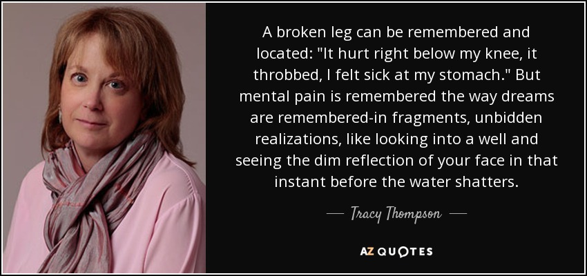 A broken leg can be remembered and located: "It hurt right below my knee, it throbbed, I felt sick at my stomach." But mental pain is remembered the way dreams are remembered-in fragments, unbidden realizations, like looking into a well and seeing the dim reflection of your face in that instant before the water shatters.