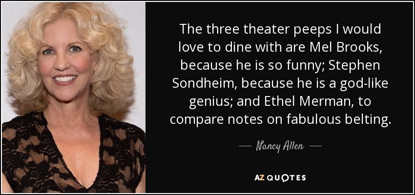 The three theater peeps I would love to dine with are Mel Brooks, because he is so funny; Stephen Sondheim, because he is a god-like genius; and Ethel Merman, to compare notes on fabulous belting.