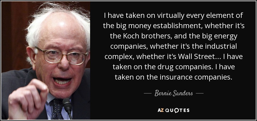 I have taken on virtually every element of the big money establishment, whether it's the Koch brothers, and the big energy companies, whether it's the industrial complex, whether it's Wall Street... I have taken on the drug companies. I have taken on the insurance companies.