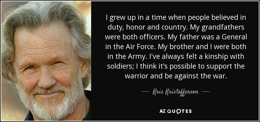 I grew up in a time when people believed in duty, honor and country. My grandfathers were both officers. My father was a General in the Air Force. My brother and I were both in the Army. I've always felt a kinship with soldiers; I think it's possible to support the warrior and be against the war.