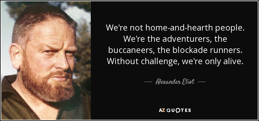 We're not home-and-hearth people. We're the adventurers, the buccaneers, the blockade runners. Without challenge, we're only alive.