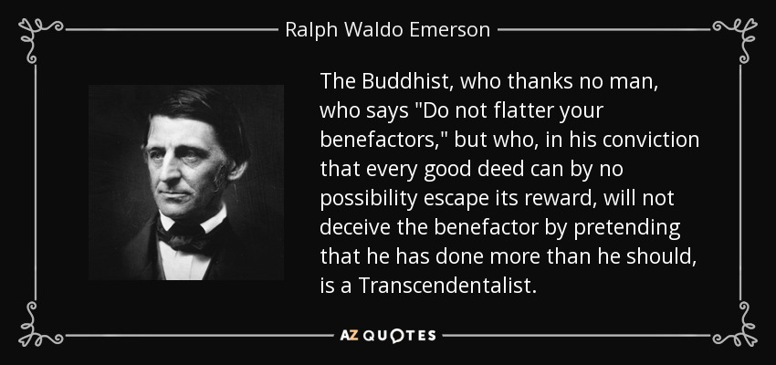 The Buddhist, who thanks no man, who says "Do not flatter your benefactors," but who, in his conviction that every good deed can by no possibility escape its reward, will not deceive the benefactor by pretending that he has done more than he should, is a Transcendentalist.