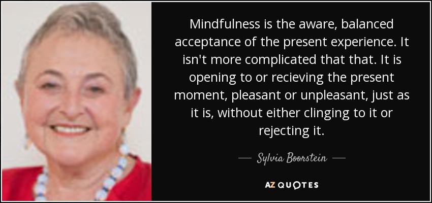 Mindfulness is the aware, balanced acceptance of the present experience. It isn't more complicated that that. It is opening to or recieving the present moment, pleasant or unpleasant, just as it is, without either clinging to it or rejecting it.