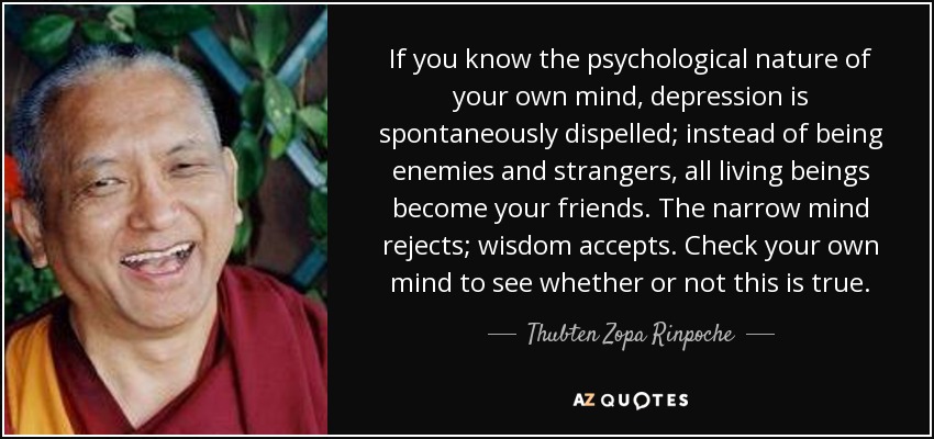If you know the psychological nature of your own mind, depression is spontaneously dispelled; instead of being enemies and strangers, all living beings become your friends. The narrow mind rejects; wisdom accepts. Check your own mind to see whether or not this is true.
