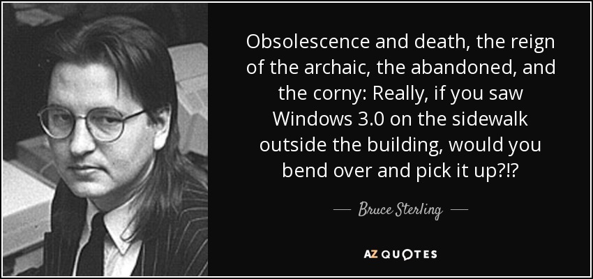 Obsolescence and death, the reign of the archaic, the abandoned, and the corny: Really, if you saw Windows 3.0 on the sidewalk outside the building, would you bend over and pick it up?!?