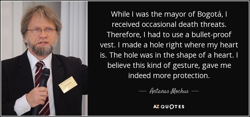While I was the mayor of Bogotá, I received occasional death threats. Therefore, I had to use a bullet-proof vest. I made a hole right where my heart is. The hole was in the shape of a heart. I believe this kind of gesture, gave me indeed more protection.