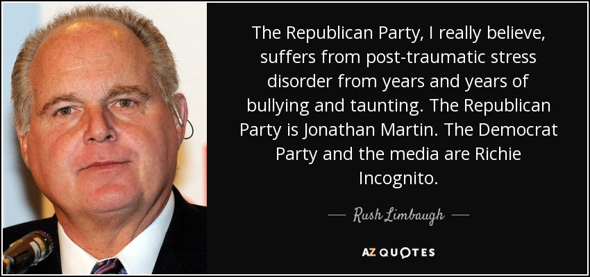 The Republican Party, I really believe, suffers from post-traumatic stress disorder from years and years of bullying and taunting. The Republican Party is Jonathan Martin. The Democrat Party and the media are Richie Incognito.