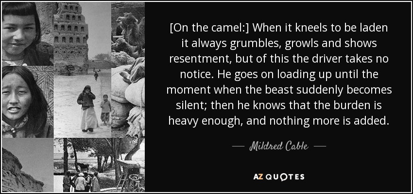 [On the camel:] When it kneels to be laden it always grumbles, growls and shows resentment, but of this the driver takes no notice. He goes on loading up until the moment when the beast suddenly becomes silent; then he knows that the burden is heavy enough, and nothing more is added.