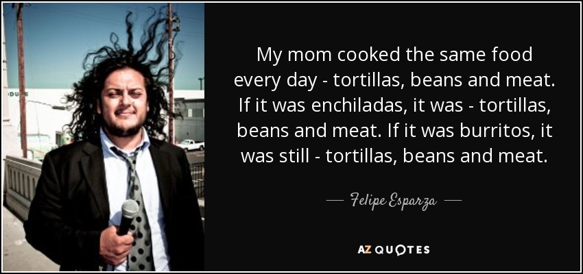 My mom cooked the same food every day - tortillas, beans and meat. If it was enchiladas, it was - tortillas, beans and meat. If it was burritos, it was still - tortillas, beans and meat.