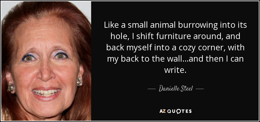 Like a small animal burrowing into its hole, I shift furniture around, and back myself into a cozy corner, with my back to the wall...and then I can write.