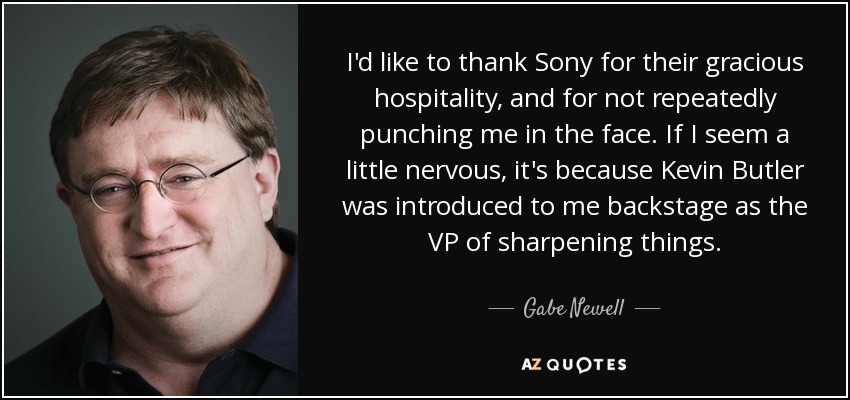 I'd like to thank Sony for their gracious hospitality, and for not repeatedly punching me in the face. If I seem a little nervous, it's because Kevin Butler was introduced to me backstage as the VP of sharpening things.