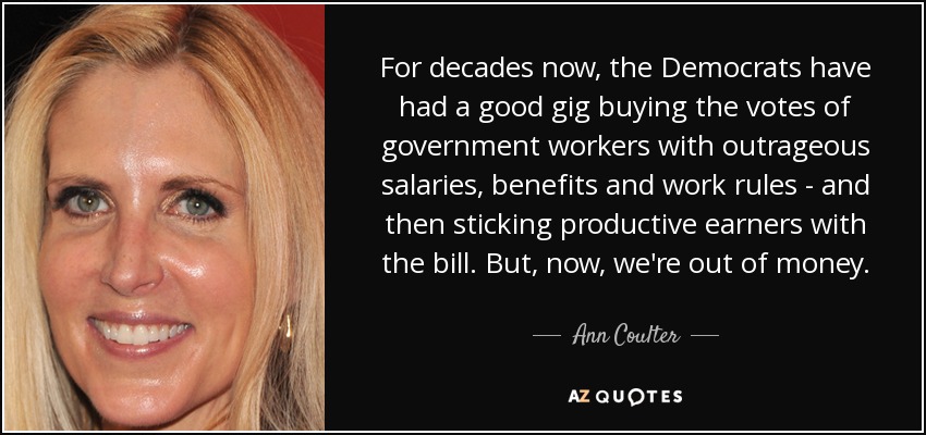 For decades now, the Democrats have had a good gig buying the votes of government workers with outrageous salaries, benefits and work rules - and then sticking productive earners with the bill. But, now, we're out of money.