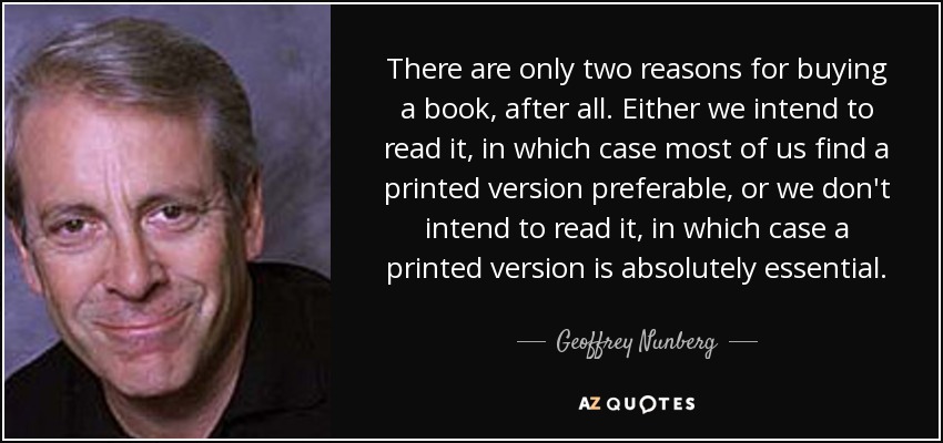 There are only two reasons for buying a book, after all. Either we intend to read it, in which case most of us find a printed version preferable, or we don't intend to read it, in which case a printed version is absolutely essential.
