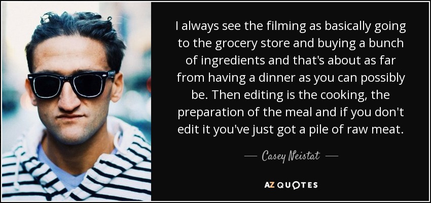 I always see the filming as basically going to the grocery store and buying a bunch of ingredients and that's about as far from having a dinner as you can possibly be. Then editing is the cooking, the preparation of the meal and if you don't edit it you've just got a pile of raw meat.