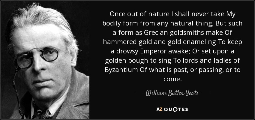 Once out of nature I shall never take My bodily form from any natural thing, But such a form as Grecian goldsmiths make Of hammered gold and gold enameling To keep a drowsy Emperor awake; Or set upon a golden bough to sing To lords and ladies of Byzantium Of what is past, or passing, or to come.
