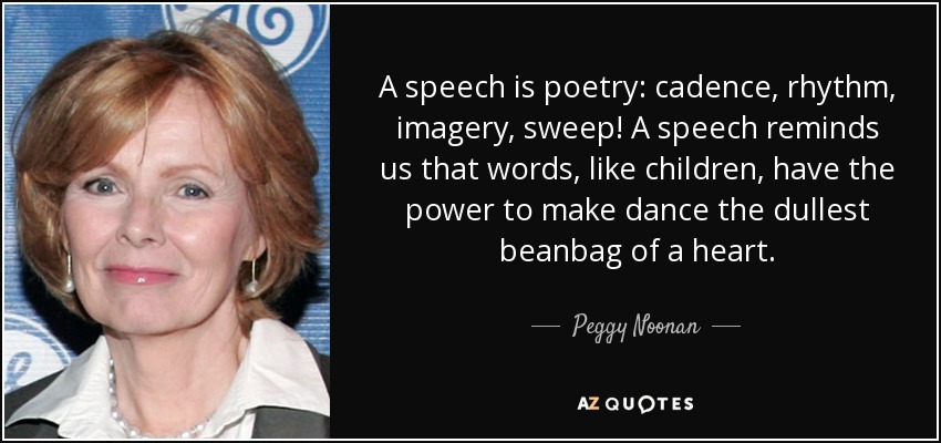 A speech is poetry: cadence, rhythm, imagery, sweep! A speech reminds us that words, like children, have the power to make dance the dullest beanbag of a heart.