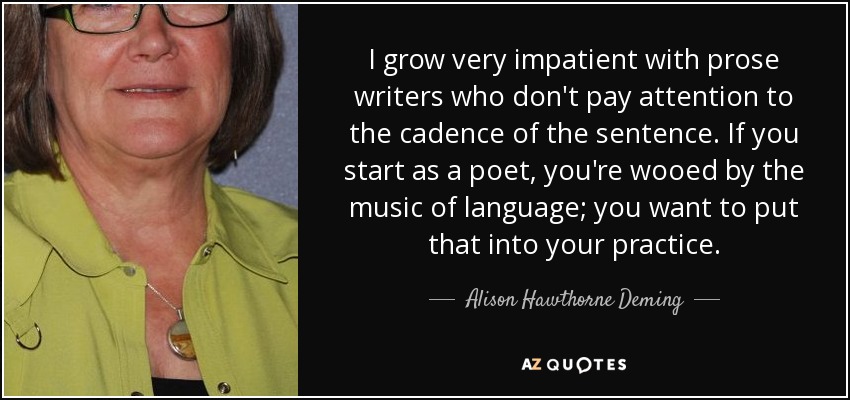 I grow very impatient with prose writers who don't pay attention to the cadence of the sentence. If you start as a poet, you're wooed by the music of language; you want to put that into your practice.