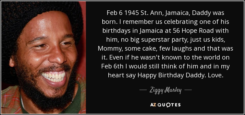 Feb 6 1945 St. Ann, Jamaica, Daddy was born. I remember us celebrating one of his birthdays in Jamaica at 56 Hope Road with him, no big superstar party, just us kids, Mommy, some cake, few laughs and that was it. Even if he wasn't known to the world on Feb 6th I would still think of him and in my heart say Happy Birthday Daddy. Love.