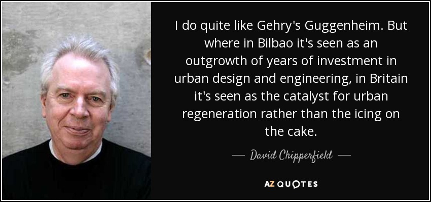 I do quite like Gehry's Guggenheim. But where in Bilbao it's seen as an outgrowth of years of investment in urban design and engineering, in Britain it's seen as the catalyst for urban regeneration rather than the icing on the cake.