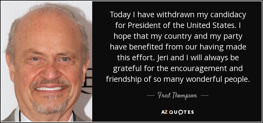 Today I have withdrawn my candidacy for President of the United States. I hope that my country and my party have benefited from our having made this effort. Jeri and I will always be grateful for the encouragement and friendship of so many wonderful people.
